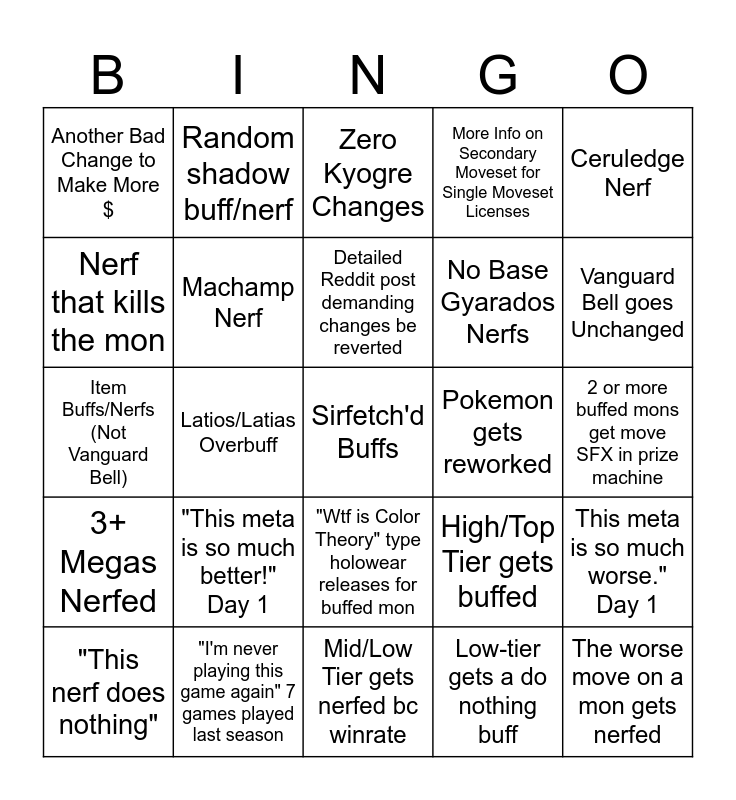 This bingo card has a free space and 24 words: "This meta is so much better!" Day 1, "I'm never playing this game again" 7 games played last season, Detailed Reddit post demanding changes be reverted, "This nerf does nothing", Ceruledge Nerf, Another Bad Change to Make More $, Nerf that kills the mon, Random shadow buff/nerf, Pokemon gets reworked, "Wtf is Color Theory" type holowear releases for buffed mon, No Base Gyarados Nerfs, Item Buffs/Nerfs (Not Vanguard Bell), High/Top Tier gets buffed, This meta is so much worse." Day 1, Machamp Nerf, Low-tier gets a do nothing buff, 2 or more buffed mons get move SFX in prize machine, Zero Kyogre Changes, Vanguard Bell goes Unchanged, Latios/Latias Overbuff, The worse move on a mon gets nerfed, 3+ Megas Nerfed, More Info on Secondary Moveset for Single Moveset Licenses and Mid/Low Tier gets nerfed bc winrate.