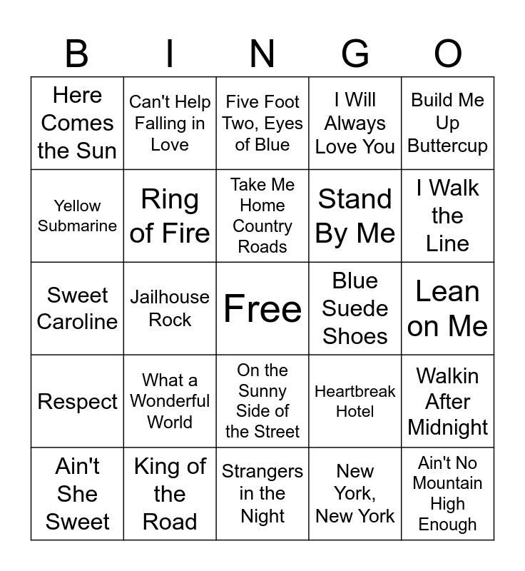 This bingo card has a free space and 24 words: What a Wonderful World, King of the Road, Take Me Home Country Roads, Ain't She Sweet, Build Me Up Buttercup, Here Comes the Sun, Yellow Submarine, Can't Help Falling in Love, Blue Suede Shoes, On the Sunny Side of the Street, Stand By Me, Sweet Caroline, Heartbreak Hotel, Walkin After Midnight, Ring of Fire, New York, New York, Lean on Me, Five Foot Two, Eyes of Blue, I Walk the Line, Jailhouse Rock, Ain't No Mountain High Enough, Respect, I Will Always Love You and Strangers in the Night.