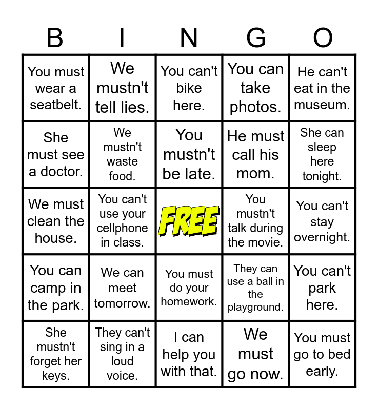 This bingo card has a free space and 26 words: You must do your homework., We must go now., You mustn't be late., They can't sing in a loud voice., He can't eat in the museum., You must wear a seatbelt., She must see a doctor., We mustn't tell lies., You can't stay overnight., They can use a ball in the playground., He must call his mom., We must clean the house., You can't park here., She mustn't forget her keys., You can't use your cellphone in class., You can wear your own clothes., You can take photos., You can camp in the park., You can't bike here., You must go to bed early., She can sleep here tonight., I can help you with that., You mustn't talk during the movie., We can meet tomorrow., We mustn't waste food. and They can't go outside now..