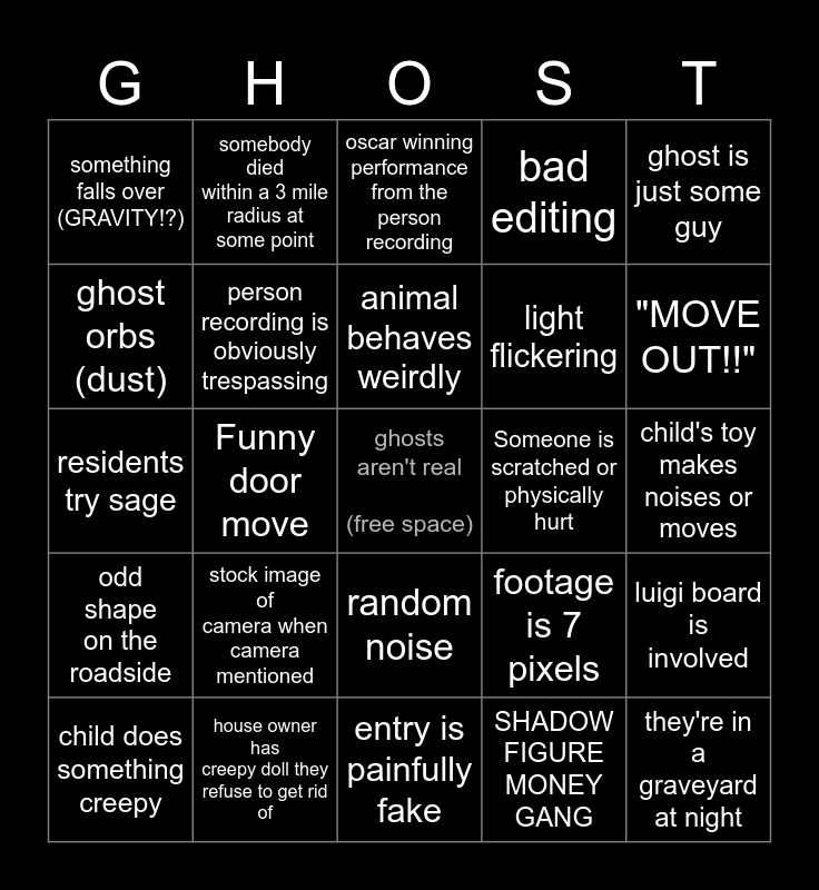 This bingo card has a free space and 24 words: stock image of camera when camera mentioned, house owner has creepy doll they refuse to get rid of, animal behaves weirdly, child does something creepy, ghost is just some guy, something falls over (GRAVITY!?), ghost orbs (dust), somebody died within a 3 mile radius at some point, Someone is scratched or physically hurt, random noise, light flickering, residents try sage, footage is 7 pixels, luigi board is involved, person recording is obviously trespassing, SHADOW FIGURE MONEY GANG, child's toy makes noises or moves, oscar winning performance from the person recording, "MOVE OUT!!", Funny door move, they're in a graveyard at night, odd shape on the roadside, bad editing and entry is painfully fake.