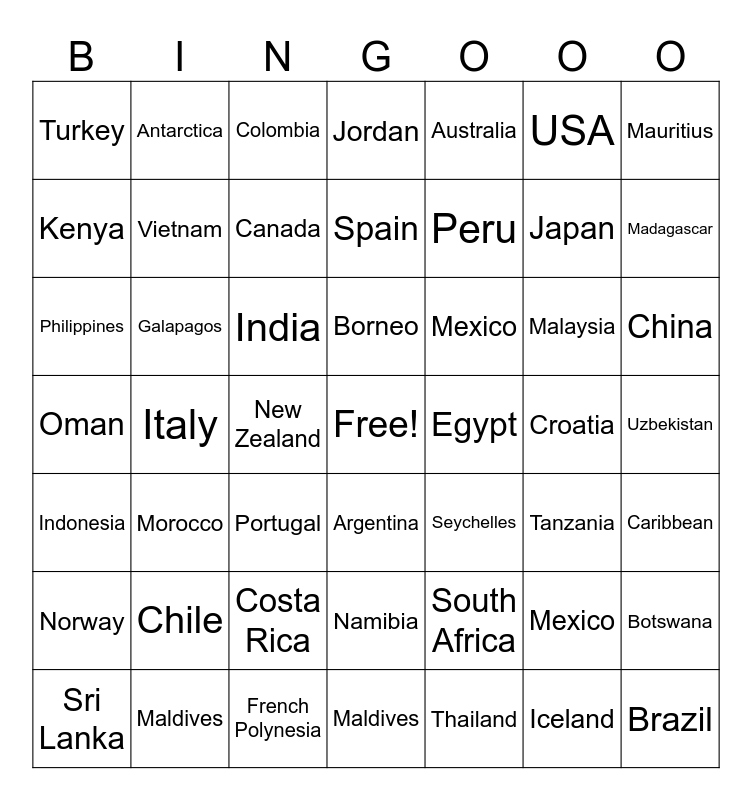 This bingo card has a free space and 48 words: South Africa, Japan, Maldives, Italy, India, Uzbekistan, Antarctica, Maldives, USA, Argentina, Mauritius, Jordan, Malaysia, Mexico, Norway, Croatia, Kenya, Madagascar, Mexico, Australia, Peru, New Zealand, Turkey, Vietnam, Botswana, Canada, China, Sri Lanka, Borneo, Galapagos, Iceland, Egypt, Caribbean, Chile, Oman, Seychelles, Tanzania, Philippines, Portugal, Costa Rica, Indonesia, Brazil, Colombia, French Polynesia, Spain, Namibia, Morocco and Thailand.