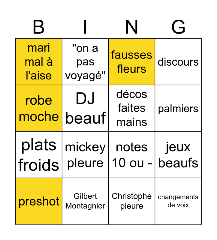 This bingo card has 16 words: Gilbert Montagnier, jeux beaufs, fausses fleurs, mari mal à l'aise, plats froids, "on a pas voyagé", notes 10 ou -, Christophe pleure, robe moche, DJ beauf, preshot, discours, mickey pleure, palmiers, décos faites mains and changements de voix.