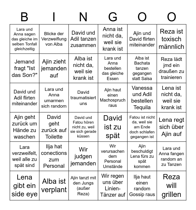 This bingo card has 36 words: Wir verursachen dem Personal Umstände, Wir judgen jemanden, Wir regen uns über Linien-Tänzer auf, Jemand fragt "Ist das Son?", Ajin geht zurück um Hände zu waschen, Ajin haut einen Machospruch raus, Ajin zieht jemanden auf, Ajin tanzt mit den Jungs (außer Reza), Ajin und David flirten miteinander, Ajin beschuldigt Lena fürs zu spät kommen, Reza lädt jmd ein draußen zu trainieren, Anna ist nicht da, weil sie krank ist, Lara und Anna fangen random an zu Tanzen, Lara und Anna umarmen sich random, Lara und Anna bestellen das gleiche Essen, Lara und Anna sagen das gleiche im selben Tonfall gleichzeitig, Lara verzweifelt, weil alle zu spät sind, Vanessa und Adil bestellen Tequila, David und Adil flirten miteinander, David und Adil tanzen zusammen, David traumatisiert uns, David geht zurück auf Toilette, David ist zu spät, David und Fatou hören nicht zu, weil sie sich gerade küssen, Fatou ist nicht da, weil sie am Ende doch schlafen gegangen ist, Blicke der Verzweiflung von Alba, Alba ist Bachata tanzen gegangen statt Salsa, Alba ist verplant, Alba ist nicht da, weil sie krank ist, Reza ist toxisch männlich, Reza will grillen, Lena gibt ein side eye, Lena regt sich über Ajin auf, Lena ist nicht da, weil sie krank ist, Ilja hat conections zum Personal and Ilja haut einen random Gossip raus.