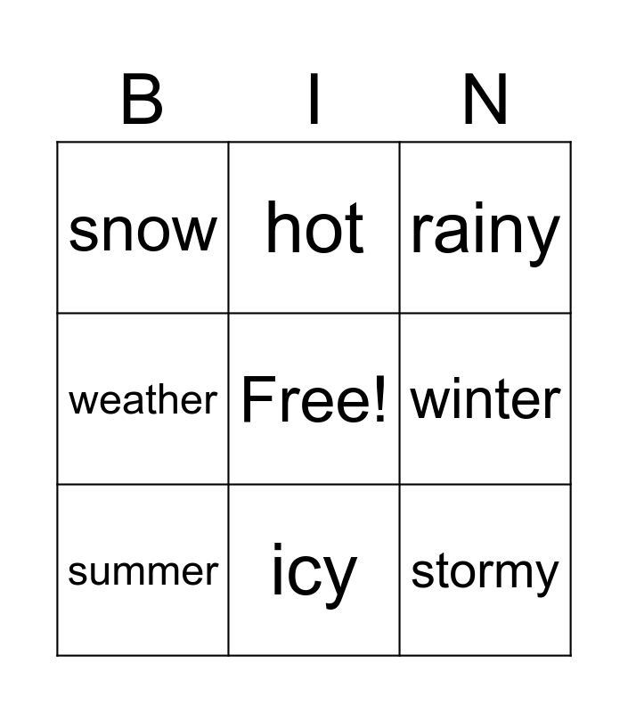 This bingo card has a free space and 20 words: cloudy, windy, rainy, sunny, cold, stormy, hot, snow, warm, hot, tornado, spring, winter, autumn, summer, foggy, icy, weather, temperature and seasons.