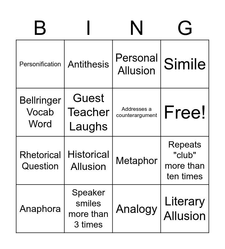 This bingo card has 18 words: Historical Allusion, Literary Allusion, Personal Allusion, Personification, Metaphor, Simile, Anaphora, Antithesis, Free!, Rhetorical Question, Analogy, Bellringer Vocab Word, Repeats "club" more than ten times, Guest Teacher Laughs, Addresses a counterargument, "Big Picture", Speaker smiles more than 3 times and Ms. Hodge laughs.