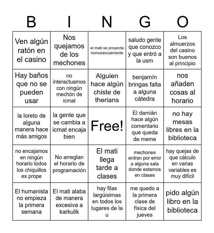 This bingo card has a free space and 24 words: No arreglan el horario de programación, El mati alaba de manera excesiva a karkulik, Alguien hace algún chiste de therians, El humanista no empieza la primera semana, Los almuerzos del casino son buenos al principio, Ven algún ratón en el casino, Hay baños que no se pueden usar, Nos quejamos de los mechones, El damián hace algún comentario que queda de meme, El mati llega tarde a clases, benjamín bringas falta a alguna cátedra, la loreto de alguna manera hace más amigos, mechones entran por error a alguna sala donde estamos en clases, hay quejas de que cálculo en varias variables es muy difícil, no interactuamos con ningún mechón de icmat, me quedo a la primera clase de física del jueves, no hay mesas libres en la biblioteca, el mati se proyecta homosexualmente, nos añaden cosas al horario, la gente que se cambia a icmat encaja bien, pido algún libro en la biblioteca, no encajamos en ningún horario todos los chiquillos ex prope, saludo gente que conozco y que entró a la usm and hay filas largúisimas en todos los lugares de la u.