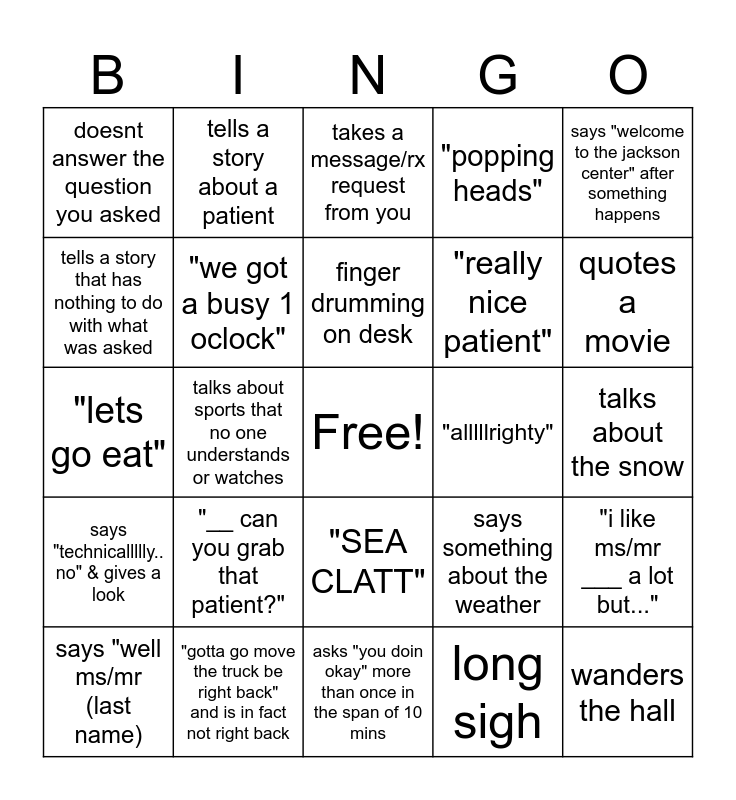 This bingo card has a free space and 24 words: says "well ms/mr (last name), "__ can you grab that patient?", finger drumming on desk, long sigh, says "welcome to the jackson center" after something happens, doesnt answer the question you asked, tells a story about a patient, takes a message/rx request from you, "alllllrighty", talks about the snow, "lets go eat", "we got a busy 1 oclock", says something about the weather, "i like ms/mr ___ a lot but...", tells a story that has nothing to do with what was asked, "gotta go move the truck be right back" and is in fact not right back, asks "you doin okay" more than once in the span of 10 mins, "popping heads", quotes a movie, says "technicallllly.. no" & gives a look, talks about sports that no one understands or watches, "SEA CLATT", "really nice patient" and wanders the hall.