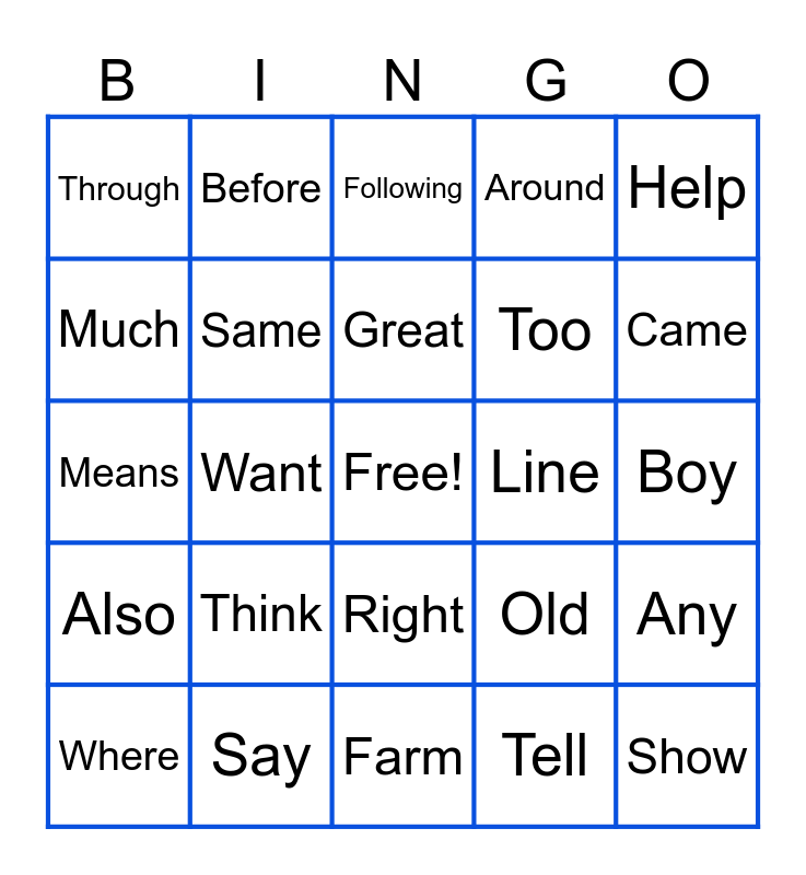 This bingo card has a free space and 24 words: Think, Say, Great, Where, Help, Through, Much, Before, Line, Right, Too, Means, Old, Any, Same, Tell, Boy, Following, Came, Want, Show, Also, Around and Farm.