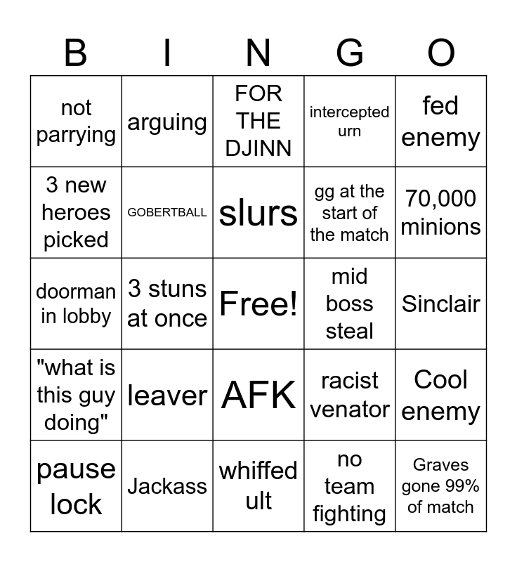 This bingo card has a free space and 24 words: leaver, Jackass, slurs, pause lock, fed enemy, not parrying, 3 new heroes picked, arguing, mid boss steal, AFK, gg at the start of the match, doorman in lobby, racist venator, Cool enemy, GOBERTBALL, no team fighting, Sinclair, FOR THE DJINN, 70,000 minions, 3 stuns at once, Graves gone 99% of match, "what is this guy doing", intercepted urn and whiffed ult.