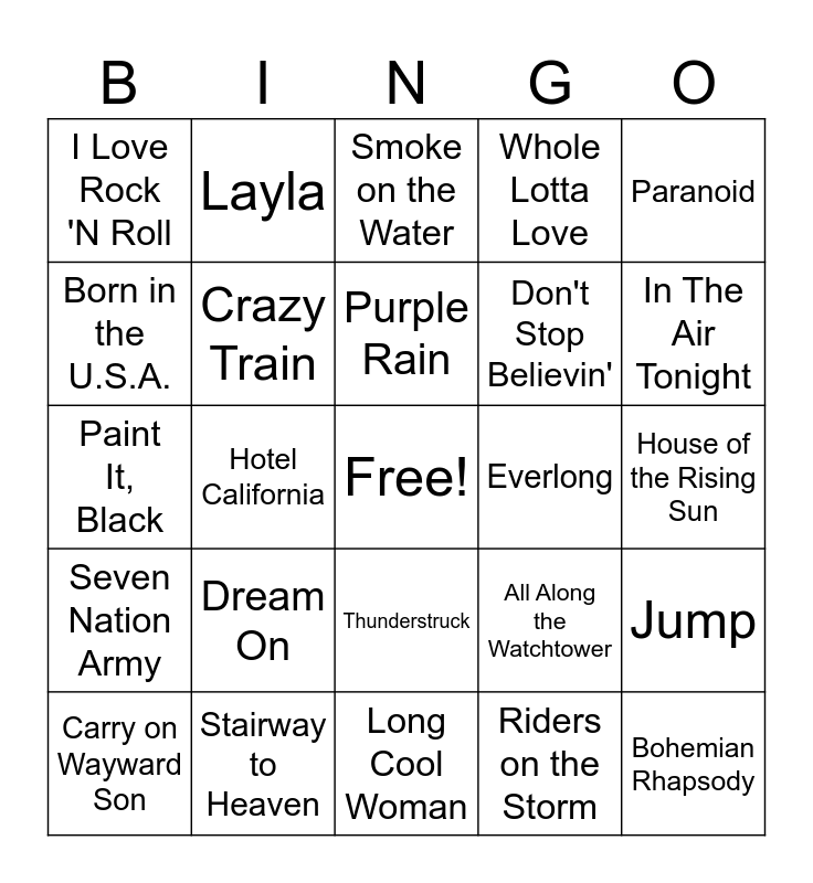 This bingo card has a free space and 41 words: Dreams, Paint It, Black, Wish You Were Here, Crazy Train, Stairway to Heaven, Thunderstruck, Purple Rain, Come As You Are, Paranoid, Seven Nation Army, Hotel California, Whole Lotta Love, Bohemian Rhapsody, House of the Rising Sun, Everlong, Dream On, Enter Sandman, I Love Rock 'N Roll, Fortunate Son, Smoke on the Water, Jump, Another Brick in the Wall, Pt. 2, Long Cool Woman, Don't Stop Believin', La Grange, Free Bird, Riders on the Storm, White Wedding, In The Air Tonight, Sweet Home Alabama, Come Together, Layla, Carry on Wayward Son, Black Hole Sun, All Along the Watchtower, Born in the U.S.A., More Than a Feeling, Slow Ride, Won't Get Fooled Again, Barracuda and You Really Got Me.