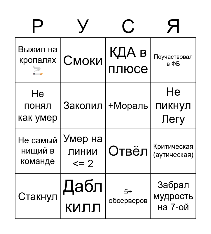 This bingo card has 16 words: Дабл килл, Критическая (аутическая), КДА в плюсе, Выжил на кропалях🚬, Не самый нищий в команде, Смоки, Отвёл, 5+ обсерверов, Не понял как умер, Заколил, Стакнул, Поучаствовал в ФБ, Умер на линии <= 2, Не пикнул Легу, +Мораль and Забрал мудрость на 7-ой.