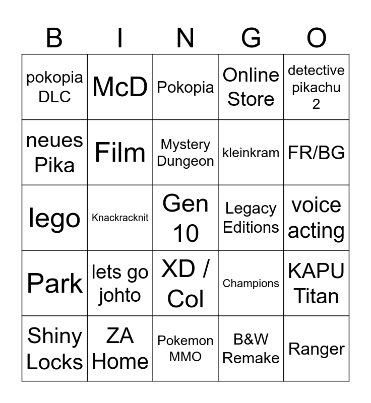 This bingo card has a free space and 24 words: lets go johto, ZA Home, Mystery Dungeon, Shiny Locks, detective pikachu 2, pokopia DLC, neues Pika, McD, Legacy Editions, XD / Col, kleinkram, lego, Champions, KAPU Titan, Film, B&W Remake, voice acting, Pokopia, FR/BG, Knackracknit, Ranger, Park, Online Store and Pokemon MMO.