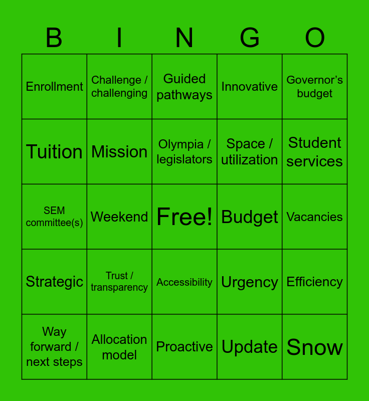 This bingo card has a free space and 24 words: Trust / transparency, Allocation model, Olympia / legislators, Way forward / next steps, Governor’s budget, Enrollment, Tuition, Challenge / challenging, Budget, Accessibility, Space / utilization, SEM committee(s), Urgency, Efficiency, Mission, Update, Vacancies, Guided pathways, Student services, Weekend, Snow, Strategic, Innovative and Proactive.