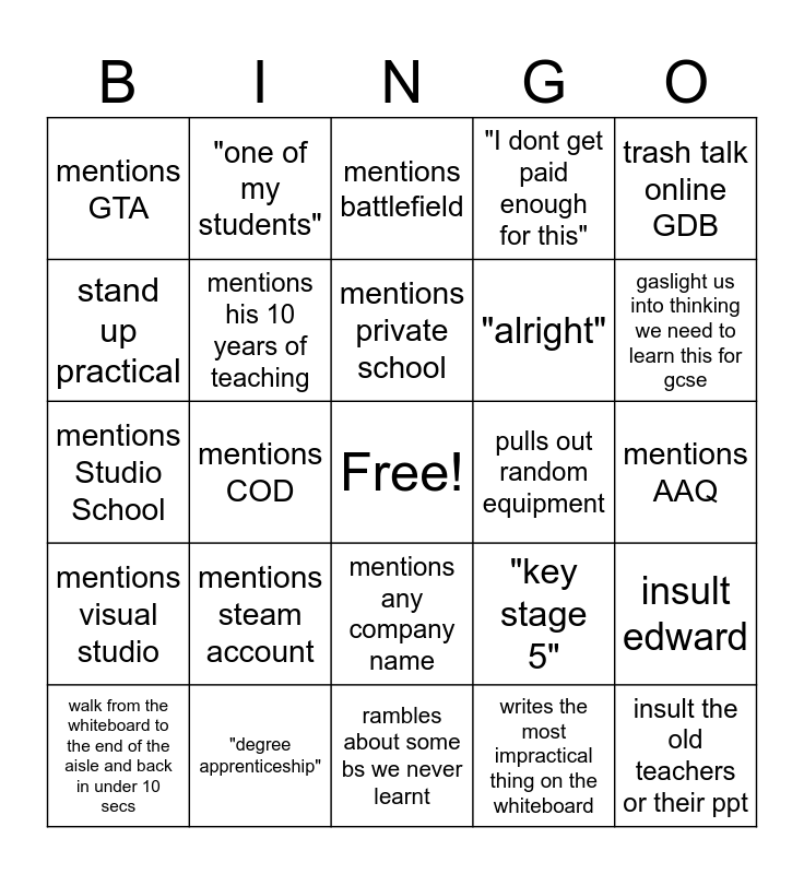 This bingo card has a free space and 24 words: mentions steam account, "degree apprenticeship", mentions private school, walk from the whiteboard to the end of the aisle and back in under 10 secs, trash talk online GDB, mentions GTA, stand up practical, "one of my students", pulls out random equipment, mentions any company name, "alright", mentions Studio School, "key stage 5", insult edward, mentions his 10 years of teaching, writes the most impractical thing on the whiteboard, mentions AAQ, mentions battlefield, gaslight us into thinking we need to learn this for gcse, mentions COD, insult the old teachers or their ppt, mentions visual studio, "I dont get paid enough for this" and rambles about some bs we never learnt.
