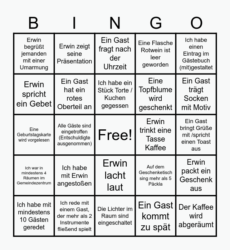 This bingo card has a free space and 24 words: Ich habe mit Erwin angestoßen, Ich rede mit einem Gast, der mehr als 2 Instrumente fließend spielt, Ich habe ein Stück Torte / Kuchen gegessen, Ich habe mit mindestens 10 Gästen geredet, Ich habe einen Eintrag im Gästebuch (mit)gestaltet, Erwin begrüßt jemanden mit einer Umarmung, Erwin spricht ein Gebet, Erwin zeigt seine Präsentation, Erwin trinkt eine Tasse Kaffee, Erwin lacht laut, Eine Topfblume wird geschenkt, Eine Geburtstagskarte wird vorgelesen, Auf dem Geschenketisch sing mehr als 5 Päckla, Erwin packt ein Geschenk aus, Ein Gast hat ein rotes Oberteil an, Ein Gast kommt zu spät, Ein Gast bringt Grüße mit /spricht einen Toast aus, Ein Gast fragt nach der Uhrzeit, Ein Gast trägt Socken mit Motiv, Alle Gäste sind eingetroffen (Entschuldigte ausgenommen), Der Kaffee wird abgeräumt, Ich war in mindestens 4 Räumen im Gemeindezentrum, Eine Flasche Rotwein ist leer geworden and Die Lichter im Raum sind eingeschaltet.