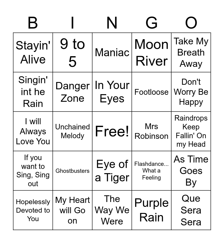 This bingo card has a free space and 33 words: The Power of Love, My Favorite Things, Unchained Melody, I Say a Little Prayer, If you want to Sing, Sing out, Danger Zone, Take My Breath Away, Hopelessly Devoted to You, 9 to 5, Take My Breath Away, In Your Eyes, Maniac, Beaty and the Beast, The Time of My Life, Mrs Robinson, Don't Worry Be Happy, My Heart will Go on, I will Always Love You, Ghostbusters, Flashdance... What a Feeling, Eye of a Tiger, Streets of Philadephia, Stayin' Alive, Raindrops Keep Fallin' On my Head, The Way We Were, Que Sera Sera, Moon River, Footloose, Singin' int he Rain, As Time Goes By, Over the Raibow, Purple Rain and Don't You (Forget about Me).