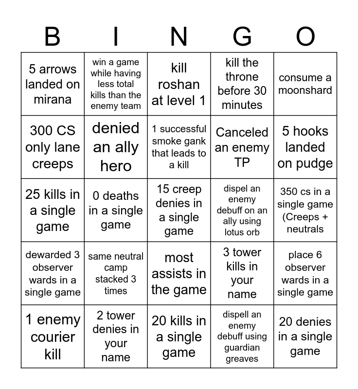 This bingo card has a free space and 24 words: same neutral camp stacked 3 times, 2 tower denies in your name, 1 successful smoke gank that leads to a kill, 1 enemy courier kill, consume a moonshard, 5 arrows landed on mirana, 300 CS only lane creeps, win a game while having less total kills than the enemy team, dispel an enemy debuff on an ally using lotus orb, most assists in the game, Canceled an enemy TP, 25 kills in a single game, 3 tower kills in your name, place 6 observer wards in a single game, denied an ally hero, dispell an enemy debuff using guardian greaves, 350 cs in a single game (Creeps + neutrals, kill roshan at level 1, 5 hooks landed on pudge, 0 deaths in a single game, 20 denies in a single game, dewarded 3 observer wards in a single game, kill the throne before 30 minutes and 20 kills in a single game.