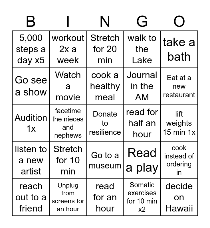 This bingo card has a free space and 24 words: Stretch for 10 min, Unplug from screens for an hour, cook a healthy meal, reach out to a friend, take a bath, 5,000 steps a day x5, Go see a show, workout 2x a week, read for half an hour, Go to a museum, Journal in the AM, Audition 1x, Read a play, cook instead of ordering in, Watch a movie, Somatic exercises for 10 min x2, lift weights 15 min 1x, Stretch for 20 min, Eat at a new restaurant, facetime the nieces and nephews, decide on Hawaii, listen to a new artist, walk to the Lake and read for an hour.