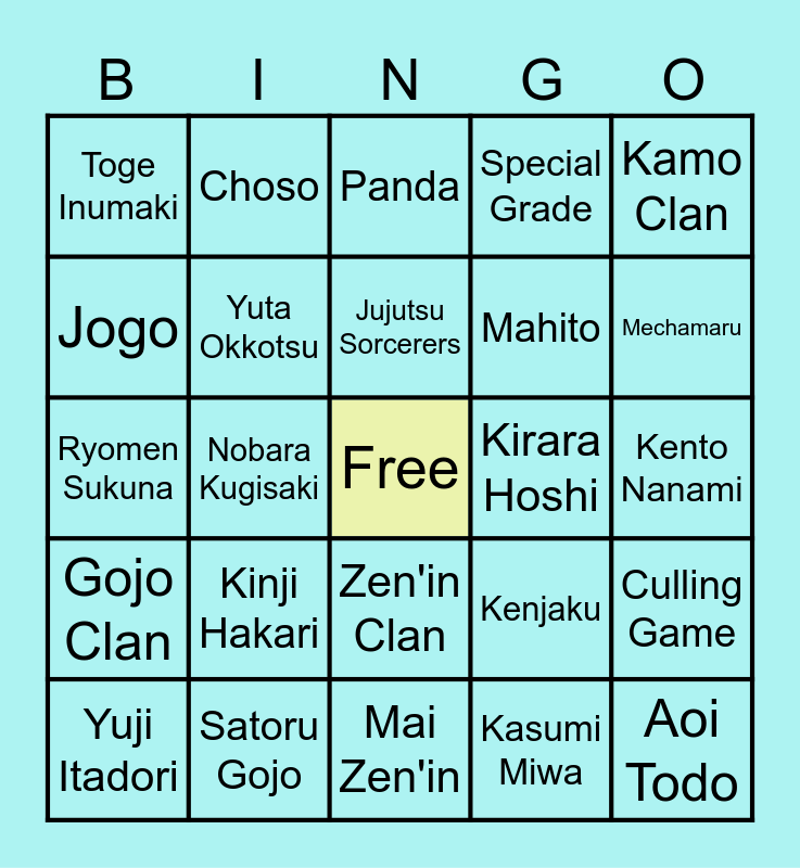 This bingo card has a free space and 29 words: Yuji Itadori, Megumi Fushiguro, Nobara Kugisaki, Maki Zen'in, Toge Inumaki, Panda, Yuta Okkotsu, Kinji Hakari, Kirara Hoshi, Satoru Gojo, Kento Nanami, Aoi Todo, Mai Zen'in, Kasumi Miwa, Mechamaru, Momo Nishimiya, Zen'in Clan, Gojo Clan, Kamo Clan, Ryomen Sukuna, Kenjaku, Suguru Geto, Mahito, Jogo, Special Grade, Choso, Culling Game, Jujutsu Sorcerers and Cursed Technique.