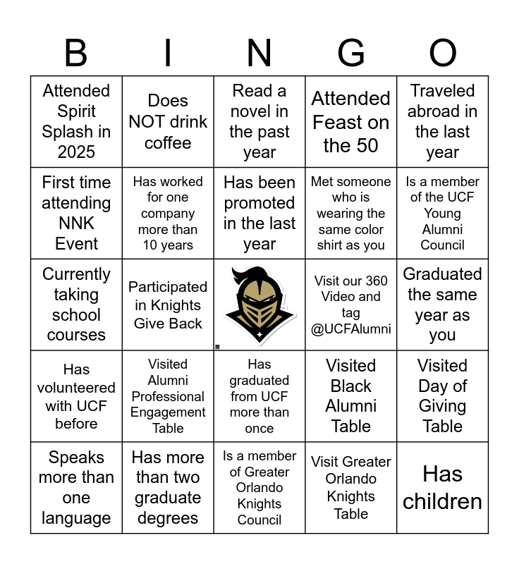 This bingo card has a free space and 43 words: Has been on movies/TV before, Participated in Knights Give Back, Does NOT have a Facebook account, Visit Greater Orlando Knights Table, Currently looking for a job, Speaks more than one language, Has worked for one company more than 10 years, Started their own company, Attended Feast on the 50, Changed jobs in the past year, Attended Spirit Splash in 2025, Visited Alumni Professional Engagement Table, Visited Black Alumni Table, Visited Day of Giving Table, Visited Continuing Education Table, Visited Office of Graduate Studies Table, Works Remotely, Visit our 360 Video and tag @UCFAlumni, Has same job title as you, Currently taking school courses, Does NOT drink coffee, Signed up on UCFKnights Network.com, Is a Mentor, Traveled abroad in the last year, Has worked outside the US, Has more than two graduate degrees, Has graduated from UCF more than once, Attended a UCF football game in 2025, Has children, Has volunteered with UCF before, Has more than 3 pets, Has been promoted in the last year, Has a professional certification, Graduated the same year as you, Lives in Orange County, Lives in Seminole County, Is a member of Greater Orlando Knights Council, Met someone who is wearing the same color shirt as you, Is a member of the UCF Young Alumni Council, First time attending NNK Event, Attended a UCF Baseball game in 2025, Read a novel in the past year and Has a Mentor.