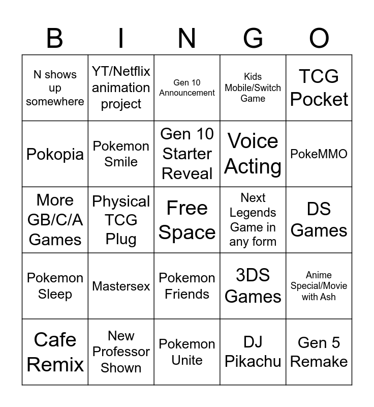 This bingo card has a free space and 24 words: Mastersex, New Professor Shown, Gen 10 Starter Reveal, Cafe Remix, TCG Pocket, N shows up somewhere, Pokopia, YT/Netflix animation project, Next Legends Game in any form, Pokemon Friends, Voice Acting, More GB/C/A Games, 3DS Games, Anime Special/Movie with Ash, Pokemon Smile, DJ Pikachu, DS Games, Gen 10 Announcement, PokeMMO, Physical TCG Plug, Gen 5 Remake, Pokemon Sleep, Kids Mobile/Switch Game and Pokemon Unite.