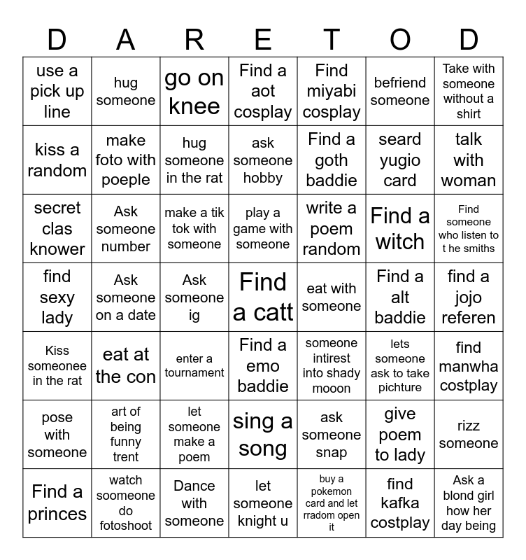 This bingo card has a free space and 48 words: Kiss someonee in the rat, Ask someone on a date, Dance with someone, Find a emo baddie, Find a goth baddie, Find a alt baddie, Take with someone without a shirt, Find a princes, Ask someone number, Ask someone ig, Find a aot cosplay, Find miyabi cosplay, Find a witch, Find someone who listen to t he smiths, find sexy lady, art of being funny trent, go on knee, play a game with someone, ask someone snap, befriend someone, talk with woman, kiss a random, hug someone, hug someone in the rat, buy a pokemon card and let rradom open it, seard yugio card, find a jojo referen, pose with someone, eat at the con, make a tik tok with someone, sing a song, write a poem random, give poem to lady, rizz someone, use a pick up line, watch soomeone do fotoshoot, enter a tournament, let someone knight u, eat with someone, find kafka costplay, find manwha costplay, secret clas knower, make foto with poeple, let someone make a poem, ask someone hobby, someone intirest into shady mooon, lets someone ask to take pichture and Ask a blond girl how her day being.