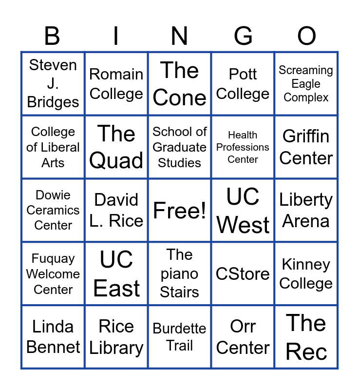 This bingo card has a free space and 29 words: Linda Bennet, H. Ray Hoops, David L. Rice, Ronald Rochon, Steven J. Bridges, The Cone, The Quad, UC East, UC West, Rice Library, Liberty Arena, The Rec, Burdette Trail, Orr Center, Griffin Center, Reflection Lake, The piano Stairs, Fuquay Welcome Center, Screaming Eagle Complex, Dowie Ceramics Center, CStore, Wright Administration Building, Health Professions Center, College of Liberal Arts, Pott College, Romain College, Kinney College, School of Graduate Studies and Online and Adult Learning.