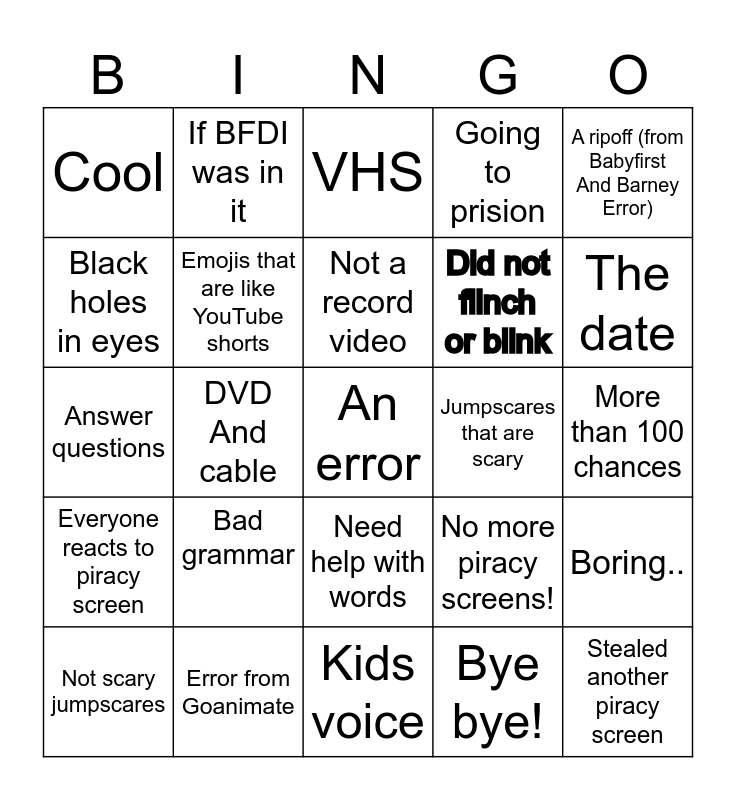 This bingo card has 25 words: Bad grammar, Kids voice, Not a record video, Not scary jumpscares, A ripoff (from Babyfirst And Barney Error), Cool, Black holes in eyes, If BFDI was in it, Jumpscares that are scary, Need help with words, Did not flinch or blink, Answer questions, No more piracy screens!, Boring.., Emojis that are like YouTube shorts, Stealed another piracy screen, More than 100 chances, VHS, The date, DVD And cable, An error, Error from Goanimate, Everyone reacts to piracy screen, Going to prision and Bye bye!.