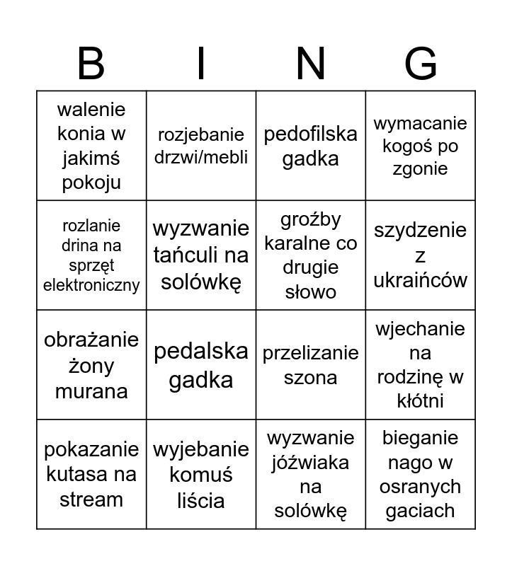 This bingo card has 16 words: wyjebanie komuś liścia, wjechanie na rodzinę w kłótni, pedofilska gadka, walenie konia w jakimś pokoju, obrażanie żony murana, rozjebanie drzwi/mebli, przelizanie szona, wyzwanie jóźwiaka na solówkę, rozlanie drina na sprzęt elektroniczny, wyzwanie tańculi na solówkę, pokazanie kutasa na stream, wymacanie kogoś po zgonie, pedalska gadka, szydzenie z ukraińców, groźby karalne co drugie słowo and bieganie nago w osranych gaciach.