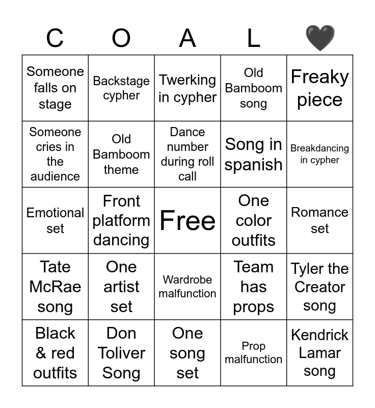 This bingo card has a free space and 24 words: Black & red outfits, One artist set, Dance number during roll call, Prop malfunction, Freaky piece, Someone falls on stage, Backstage cypher, Twerking in cypher, One color outfits, Romance set, Emotional set, Old Bamboom theme, Team has props, Tyler the Creator song, Someone cries in the audience, Don Toliver Song, One song set, Old Bamboom song, Breakdancing in cypher, Tate McRae song, Front platform dancing, Wardrobe malfunction, Song in spanish and Kendrick Lamar song.