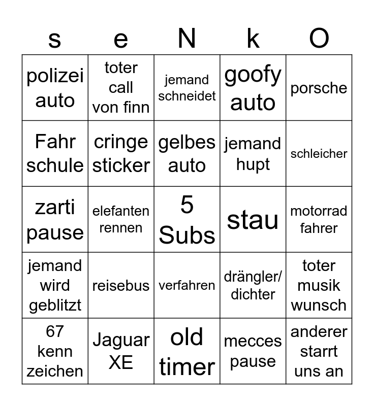 This bingo card has a free space and 24 words: reisebus, Jaguar XE, gelbes auto, 67 kenn zeichen, porsche, polizei auto, Fahr schule, toter call von finn, stau, verfahren, jemand hupt, zarti pause, drängler/ dichter, toter musik wunsch, cringe sticker, mecces pause, motorrad fahrer, jemand schneidet, schleicher, elefanten rennen, anderer starrt uns an, jemand wird geblitzt, goofy auto and old timer.