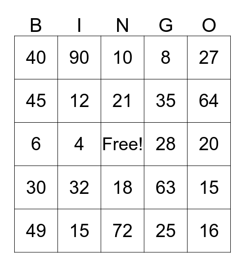 This bingo card has a free space and 40 words: 3, 6, 9, 12, 15, 18, 21, 24, 27, 30, 4, 8, 16, 20, 28, 32, 36, 40, 5, 10, 15, 25, 35, 45, 50, 42, 48, 54, 60, 7, 14, 49, 56, 63, 64, 72, 80, 81, 90 and 100.