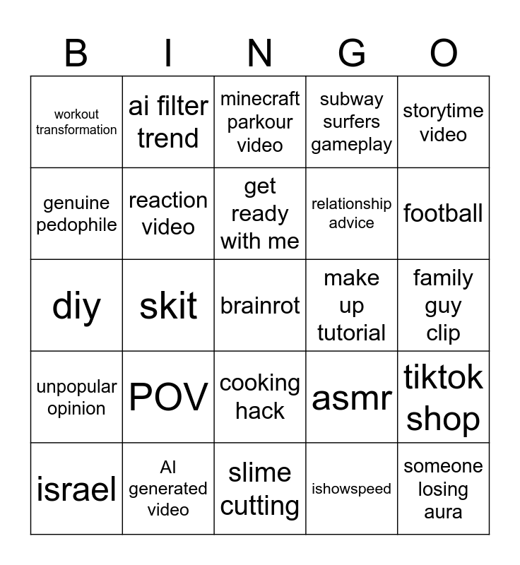 This bingo card has a free space and 24 words: POV, AI generated video, get ready with me, israel, storytime video, workout transformation, genuine pedophile, ai filter trend, make up tutorial, cooking hack, relationship advice, diy, asmr, tiktok shop, reaction video, ishowspeed, family guy clip, minecraft parkour video, football, skit, someone losing aura, unpopular opinion, subway surfers gameplay and slime cutting.