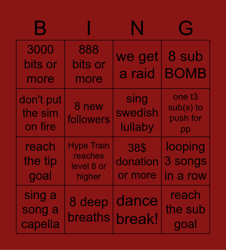 This bingo card has 16 words: 8 deep breaths, looping 3 songs in a row, we get a raid, 3000 bits or more, reach the tip goal, 888 bits or more, 38$ donation or more, dance break!, don't put the sim on fire, 8 new followers, sing a song a capella, 8 sub BOMB, Hype Train reaches level 8 or higher, one t3 sub(s) to push for pp, sing swedish lullaby and reach the sub goal.