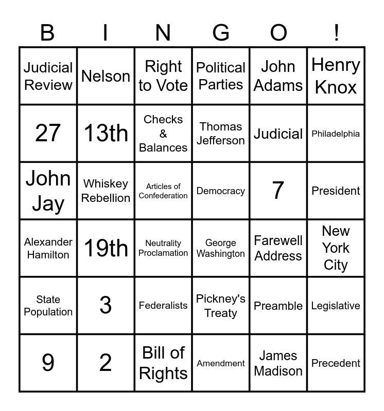 This bingo card has 36 words: Pickney's Treaty, Federalists, Amendment, 27, Alexander Hamilton, Democracy, 13th, Bill of Rights, John Adams, Preamble, Philadelphia, Political Parties, Legislative, Whiskey Rebellion, Thomas Jefferson, Judicial Review, State Population, 7, John Jay, Right to Vote, Articles of Confederation, 19th, George Washington, Neutrality Proclamation, Farewell Address, Nelson, Judicial, 2, Checks & Balances, Henry Knox, Precedent, 9, New York City, President, 3 and James Madison.
