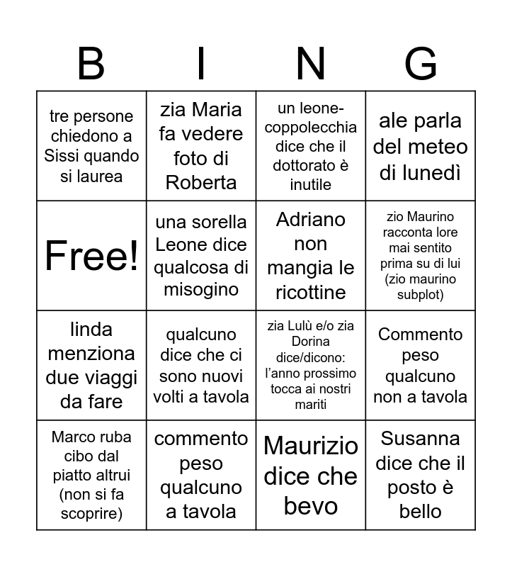 This bingo card has 16 words: commento peso qualcuno a tavola, Commento peso qualcuno non a tavola, un leone-coppolecchia dice che il dottorato è inutile, tre persone chiedono a Sissi quando si laurea, linda menziona due viaggi da fare, zia Maria fa vedere foto di Roberta, zia Lulù e/o zia Dorina dice/dicono: l’anno prossimo tocca ai nostri mariti, Maurizio dice che bevo, Free!, una sorella Leone dice qualcosa di misogino, Marco ruba cibo dal piatto altrui (non si fa scoprire), ale parla del meteo di lunedì, qualcuno dice che ci sono nuovi volti a tavola, zio Maurino racconta lore mai sentito prima su di lui (zio maurino subplot), Adriano non mangia le ricottine and Susanna dice che il posto è bello.