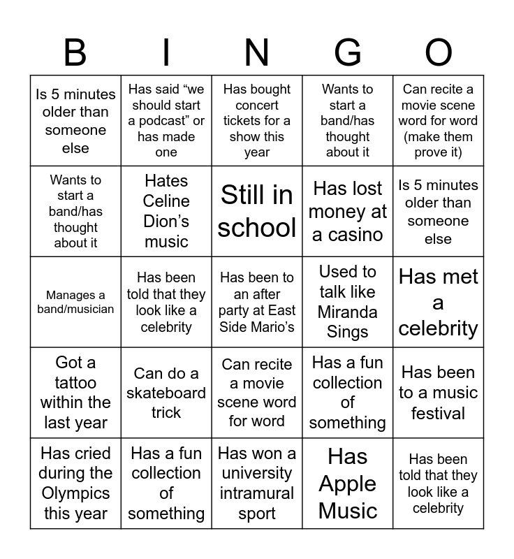 This bingo card has 57 words: Still in school, Has cried during the Olympics this year, Has thrown up from drinking somewhere other than a bathroom, Is 5 minutes older than someone else, Has won a university intramural sport, Has been kicked out of a bar, Hates Celine Dion’s music, Favourite hockey team is the Boston Bruins, Has lost money at a casino, Has met a celebrity, Wants to start a band/has thought about it, Has known me (Lia) for 14+ years, Manages a band/musician, Has a cottage, Got a tattoo within the last year, Has said “we should start a podcast” or has made one, Can recite a movie scene word for word (make them prove it), Has been told that they look like a celebrity, Can play the saxophone, Has been to an after party at East Side Mario’s, Used to talk like Miranda Sings, Can do a skateboard trick, Has a fun collection of something, Has bought concert tickets for a show this year, Has been on the dating app Raya, Still in school, Has cried during the Olympics this year, Has thrown up from drinking somewhere other than a bathroom, Is 5 minutes older than someone else, Has won a university intramural sport, Has been kicked out of a bar, Has worn an inflatable Raptor’s costume, Favourite hockey team is the Boston Bruins, Has lost money at a casino, Has met a celebrity, Wants to start a band/has thought about it, Has known me (Lia) for 14+ years, Manages a band/musician, Has a cottage, Got a tattoo within the last year, Has said “we should start a podcast” or has made one, Can recite a movie scene word for word, Has been told that they look like a celebrity, Can play the saxophone, Has been to an after party at East Side Mario’s, Used to talk like Miranda Sings, Can do a skateboard trick, Has a fun collection of something, Has bought concert tickets for a show this year, Has been on the dating app Raya, Uses a record player regularly, Has Apple Music, Actually likes playing golf, Has owned a band t-shirt for a band they didn’t listen to, Frequently goes to Florida, Has been to a music festival and Has dressed up as a Gucci Flip Flop for Halloween.