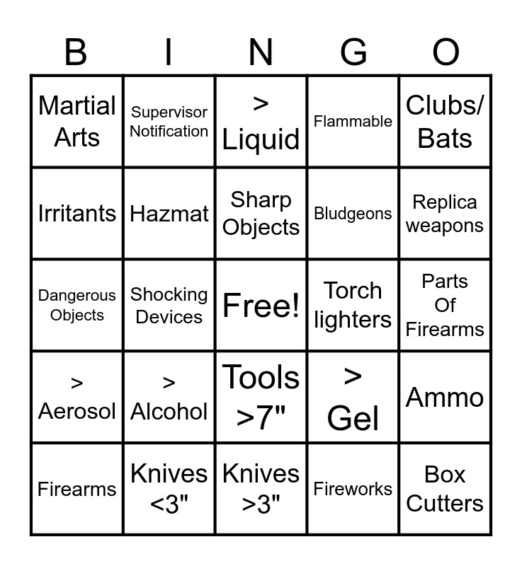 This bingo card has a free space and 24 words: > Alcohol, Knives <3", Sharp Objects, Firearms, Clubs/ Bats, Martial Arts, Irritants, Supervisor Notification, Torch lighters, Tools >7", Bludgeons, Dangerous Objects, > Gel, Ammo, Hazmat, Fireworks, Parts Of Firearms, > Liquid, Replica weapons, Shocking Devices, Box Cutters, > Aerosol, Flammable and Knives >3".