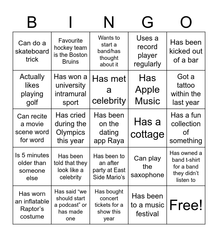 This bingo card has 33 words: Free!, Still in school, Has cried during the Olympics this year, Has thrown up from drinking somewhere other than a bathroom, Is 5 minutes older than someone else, Has won a university intramural sport, Has been kicked out of a bar, Has worn an inflatable Raptor’s costume, Favourite hockey team is the Boston Bruins, Has lost money at a casino, Has met a celebrity, Wants to start a band/has thought about it, Has known me (Lia) for 14+ years, Manages a band/musician, Has a cottage, Got a tattoo within the last year, Has said “we should start a podcast” or has made one, Can recite a movie scene word for word, Has been told that they look like a celebrity, Can play the saxophone, Has been to an after party at East Side Mario’s, Used to talk like Miranda Sings, Can do a skateboard trick, Has a fun collection of something, Has bought concert tickets for a show this year, Has been on the dating app Raya, Uses a record player regularly, Has Apple Music, Actually likes playing golf, Has owned a band t-shirt for a band they didn’t listen to, Frequently goes to Florida, Has been to a music festival and Has dressed up as a Gucci Flip Flop for Halloween.