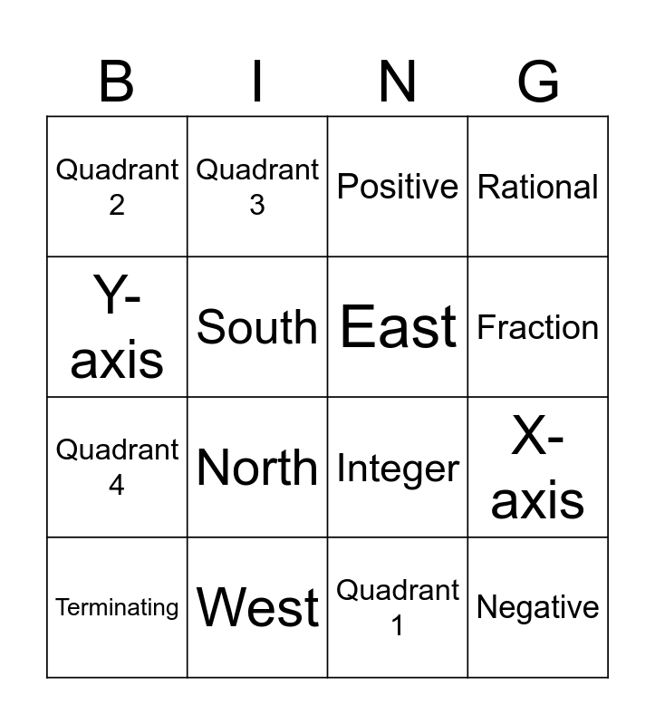 This bingo card has 19 words: Integer, Absolute Value, Positive, Negative, X-axis, Y-axis, Quadrant 1, Quadrant 2, Quadrant 3, Quadrant 4, North, South, East, West, Terminating, Repeating, Rational, Fraction and Decimal.