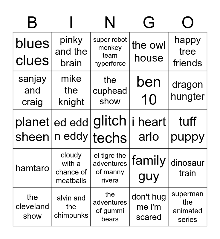 This bingo card has 195 words: dexter's laboratory, hilda, dave the barbarian, pucca, skatoony, pokemon, foster home for imaginary, super why, transformers g1, ben 10, bubble guppies, king of the hill, doug, middlemost post, teenage mitant ninja turtles, ok ko let's be heroes, 64 zoo lane, flying rhino junior high, the grim adventures of billy and mandy, fireman sam, bakugan, the magic school bus, reboot, catdog, alvin and the chimpunks, harvey beaks, hotel transylvania the series, wild kratts, family guy, thomas and friends, the ghpsy and mollu mcgee, the cleveland show, lego china, bluey, as told by ginger, peter rabbit, superjail, rick and morty, the amazing digital circus, mona the vampire, puss in boots, kirby right back at ya!, hey arnold, talespin, invader zim, home movies, blues clues, the loud house, cow and chicken, happy tree friends, the owl house, planet sheen, mickey mouse clubhouse, grojband, rocko's modern life, geronimo stilton, teen titans, glitch techs, pat and star, goof troop, kung fu panda legends of awesomeness, el tigre the adventures of manny rivera, animaniacs, johnny bravo, beavis and butthead, don't hug me i'm scared, kipo and the of wonderbests, ed edd n eddy, the boondocks, teletubbies, dora the explorer, rolie polie olie, pinky and the brain, the super mario bros super show, spongebob squarepants, generator rex, hamtaro, hero 108, the looney tunes show, pocoyo, smling friends, the amazing adrenalini brothers, mr men, brady's beasts, the cuphead show, back at the barnyard, 2 stupid dogs, adventures of sonic the hgehog, danny phantom, gargoyles, dragon hungter, barney and friends, bear in the blues house, cybersix, the adventures of gummi bears, pippi longstoking, evil con carne, lego ninjago, randy cunningham 9th grade ninja, green eggs and ham, american dad, mask, word girl, dragons riders of berk, the casagrandes, the buzz on maggie, avatar the last airbender, growing up creepie, rocket power, south park, oswald, robot and monster, strange hill high, corneil and bernie, camp lazlo, superman the animated series, super mario world, witch, tangled the series, kablam!, elena of avalot, 321 penguins, wow wow wubbzy, rocket monkeys, my little pony friendship of magic, hi hi puffy ami yumi, captain n, jem and the holgrams, polly pocket, slugterra, the proud family, sailor moon, dinosaur king, tuff puppy, baby looney tunes, martin mystery, cliffred the big red dog, oggy and the cockroaches, poochini, totally spies, close enough, the jetsons, noddy, legend quest, sanjay and craig, clarence, welcome to the wayne, almost naked animals, mia and me, tiny toon adventures, sitting ducks, codename kids next door, george of the jungle, it's pony, craig of the creek, arthur, go diego go, space goofs, epithet erased, iron man armored adventures, little einsteins, class of 3000, the legend of zelda, super robot monkey team hyperforce, kid comic, ren and stimpy, the angry beavers, the weekenders, recess, ben aand holly's little kingdom, steven universe, thundercats, sonic the hedgehog, dinosaur train, jimmy two shoes, street sharks, biker mice from mars, team galaxy, mr meaty, bob's burgers, duck dodgers, centaurworld, my gym parnter's a monkey, the fairly oddparents, pj masks, horrid henry, mike the knight, cloudy with a chance of meatballs, adventures time, teen titans go, catscratch, oddballs, sesame street, i heart arlo and ar.