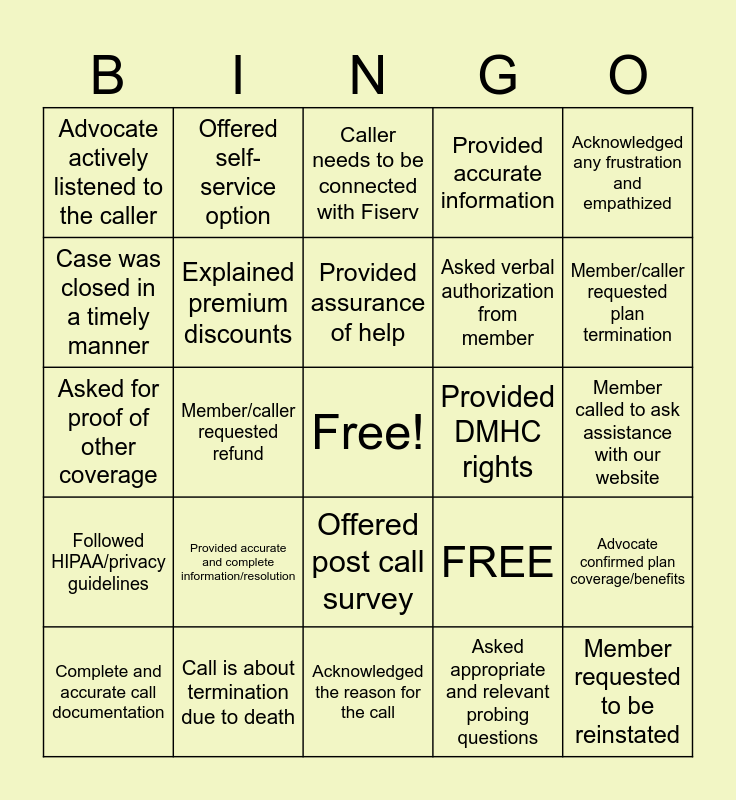 This bingo card has a free space and 25 words: Provided accurate and complete information/resolution, Acknowledged the reason for the call, Provided assurance of help, Complete and accurate call documentation, Acknowledged any frustration and empathized, Advocate actively listened to the caller, Case was closed in a timely manner, Offered self-service option, Provided DMHC rights, Offered post call survey, Asked verbal authorization from member, Asked for proof of other coverage, FREE, Advocate confirmed plan coverage/benefits, Explained premium discounts, Member wants to confirm premium amount due, Member called to ask assistance with our website, Caller needs to be connected with Fiserv, Member/caller requested plan termination, Member/caller requested refund, Member requested to be reinstated, Call is about termination due to death, Followed HIPAA/privacy guidelines, Provided accurate information and Asked appropriate and relevant probing questions.
