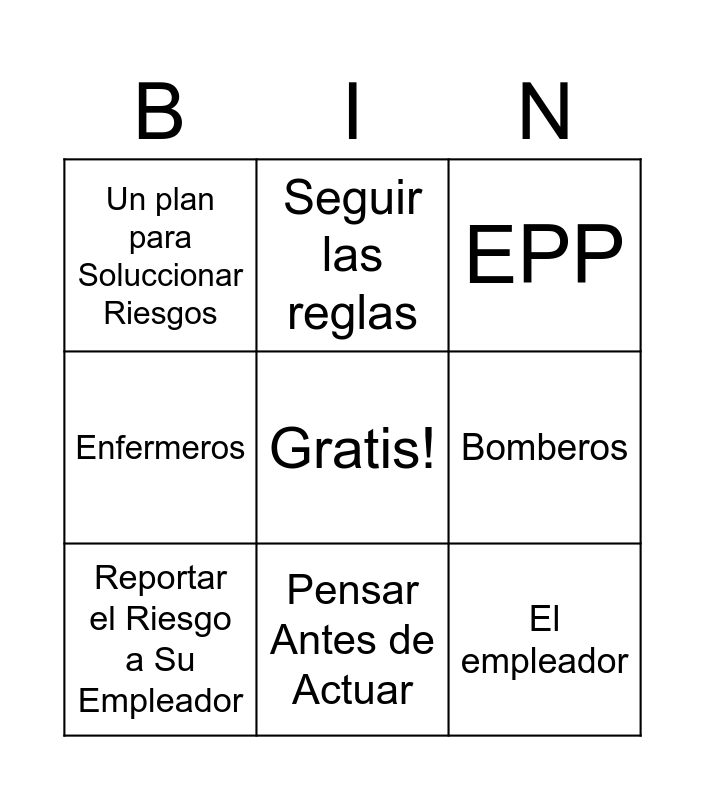 This bingo card has a free space and 30 words: Información, Protección, Tomar Acción, Un plan para Identificar Riesgos, Un plan para Soluccionar Riesgos, EPP, Reportar el Riesgo a Su Empleador, Documentar el Problema, Unirse con Otros Trabajdores, Reclamo a Cal/OSHA, $16.90, La Hoja de Datos, Capacitación Sobre los Productos, El Calor, Violencia de Lugar de Trabajo, Trabajadores domésticas, Personas indocumentadas, Reportar imediatemente el riesgo, Solicitud de Compensación Laboral, El empleador, El trabajador, Esperar, Seguir las reglas, Bailar, Bomberos, Enfermeros, Escuchar a su Empleador, Tomar precaucciones, Pensar Antes de Actuar and Hacer nada.