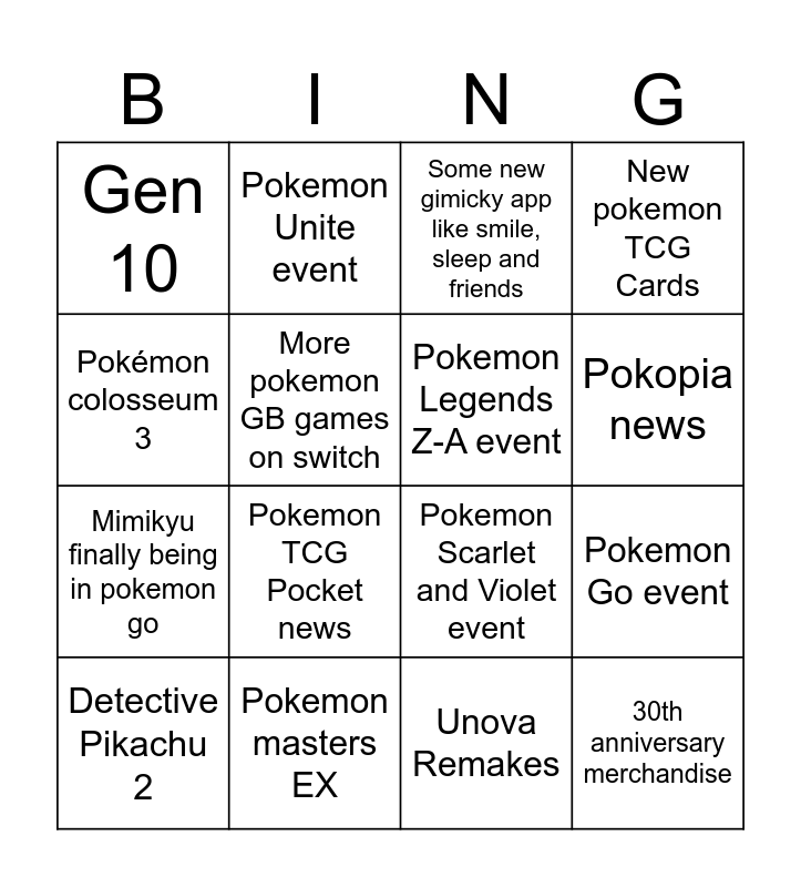 This bingo card has 16 words: Pokemon masters EX, Pokemon Go event, Some new gimicky app like smile, sleep and friends, Gen 10, Mimikyu finally being in pokemon go, Pokemon Unite event, Pokemon Scarlet and Violet event, Unova Remakes, Pokémon colosseum 3, More pokemon GB games on switch, Detective Pikachu 2, New pokemon TCG Cards, Pokemon TCG Pocket news, Pokopia news, Pokemon Legends Z-A event and 30th anniversary merchandise.