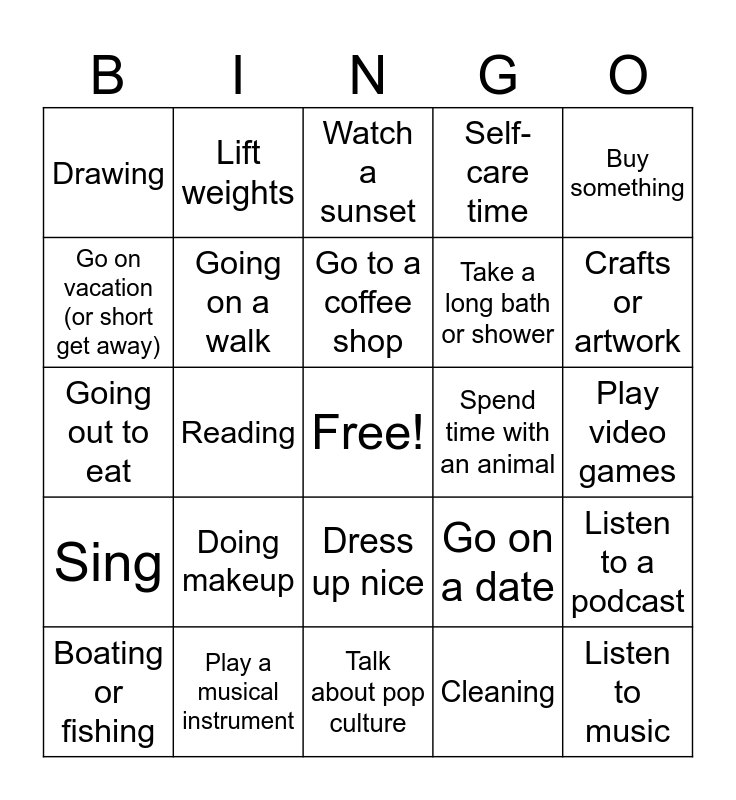 This bingo card has a free space and 29 words: Boating or fishing, Playing Board games, Reading, Doing a puzzle, Drawing, Watch a sunset, Going on a walk, Doing makeup, Spend time with an animal, Play a musical instrument, Play video games, Listen to music, Talk about pop culture, Cleaning, Crafts or artwork, Play with cards, Dress up nice, Sing, Buy something, Going out to eat, Go on a date, Thrifting, Take a long bath or shower, Go on vacation (or short get away), Self-care time, Lift weights, Listen to a podcast, Go to a coffee shop and Pick out a new book.