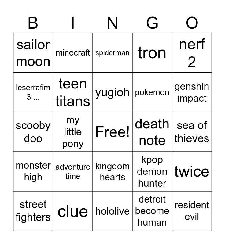 This bingo card has a free space and 24 words: adventure time, clue, yugioh, street fighters, nerf 2, sailor moon, leserrafim 3 ..., minecraft, death note, kingdom hearts, pokemon, scooby doo, kpop demon hunter, twice, teen titans, detroit become human, sea of thieves, spiderman, genshin impact, my little pony, resident evil, monster high, tron and hololive.
