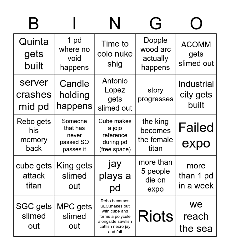 This bingo card has a free space and 24 words: King gets slimed out, MPC gets slimed out, Antonio Lopez gets slimed out, SGC gets slimed out, ACOMM gets slimed out, Quinta gets built, server crashes mid pd, 1 pd where no void happens, the king becomes the female titan, jay plays a pd, story progresses, Rebo gets his memory back, more than 5 people die on expo, more than 1 pd in a week, Candle holding happens, Riots, Failed expo, Time to colo nuke shig, Industrial city gets built, Someone that has never passed SO passes it, we reach the sea, cube gets attack titan, Dopple wood arc actually happens and Rebo becomes SLC,makes out with cube and forms a polycule alongside sawfish catfish necro jay and fail.