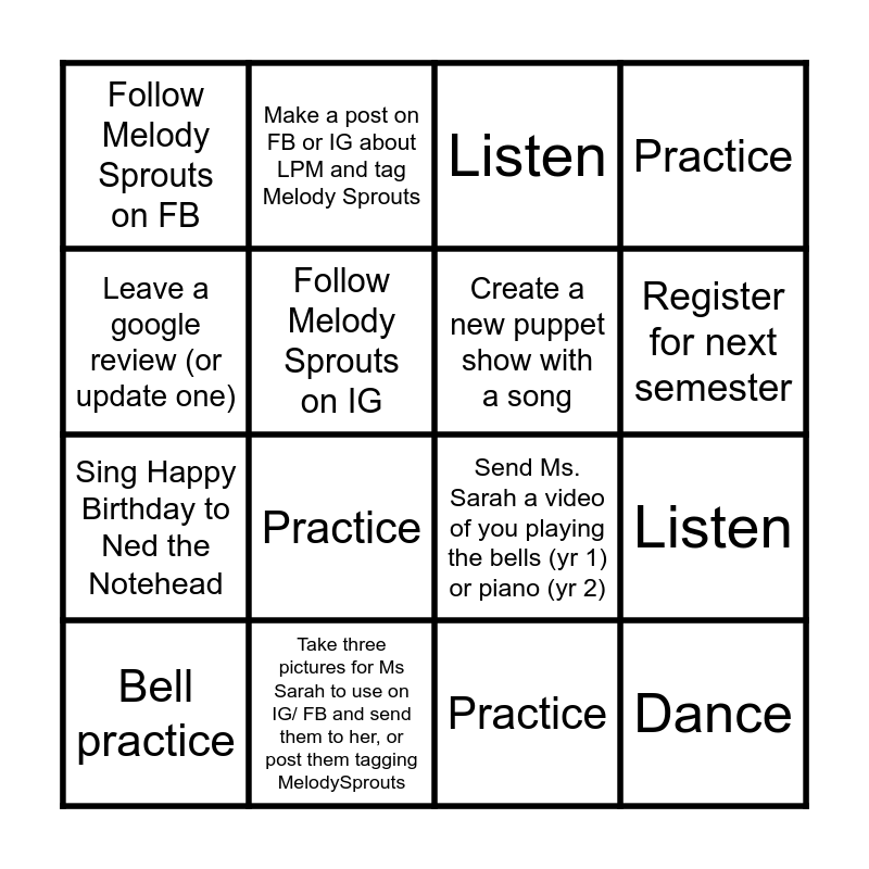 This bingo card has 25 words: Wear LPM shirt to class, Bring a friend and parent to class, Register for next semester, Send two texts to friends telling them about Melody Sprouts, Leave a google review (or update one), Follow Melody Sprouts on FB, Follow Melody Sprouts on IG, Make a post on FB or IG about LPM and tag Melody Sprouts, Take three pictures for Ms Sarah to use on IG/ FB and send them to her, or post them tagging MelodySprouts, Share a video of your child doing something from class, Sing Happy Birthday to Ned the Notehead, Send Ms. Sarah a video of you playing the bells (yr 1) or piano (yr 2), Share your video with a family member that lives somewhere else, Draw a picture of your favorite puppet show, Create a new puppet show with a song, Refer a friend who is interested, Practice, Listen, Practice, Listen, Bell practice, Sing, Dance, Practice and Homework.