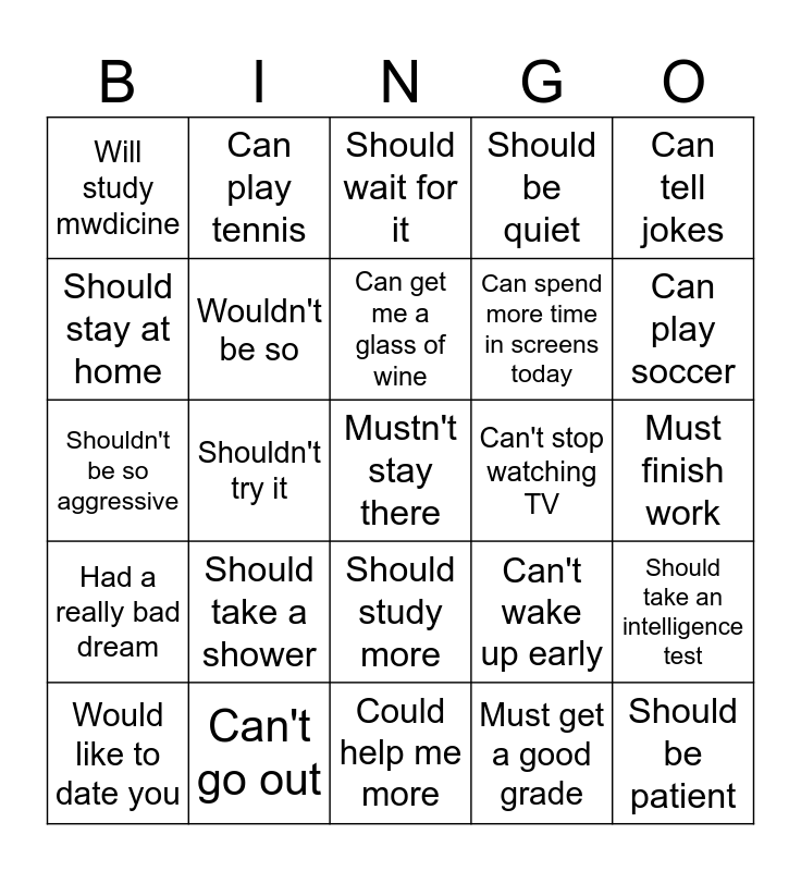 This bingo card has 25 words: Should take a shower, Could help me more, Can get me a glass of wine, Would like to date you, Can tell jokes, Will study mwdicine, Should stay at home, Can play tennis, Can't stop watching TV, Should study more, Can spend more time in screens today, Shouldn't be so aggressive, Can't wake up early, Should take an intelligence test, Wouldn't be so, Should be patient, Must finish work, Should wait for it, Can play soccer, Shouldn't try it, Mustn't stay there, Can't go out, Had a really bad dream, Should be quiet and Must get a good grade.