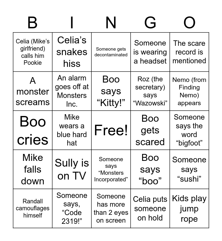 This bingo card has a free space and 24 words: Sully is on TV, Someone says, “Code 2319!”, Boo says “Kitty!”, Randall camouflages himself, The scare record is mentioned, Celia (Mike’s girlfriend) calls him Pookie, A monster screams, Celia’s snakes hiss, Boo gets scared, Someone says “Monsters Incorporated”, Roz (the secretary) says “Wazowski”, Boo cries, Boo says “boo”, Someone says “sushi”, An alarm goes off at Monsters Inc., Celia puts someone on hold, Someone says the word “bigfoot”, Someone gets decontaminated, Nemo (from Finding Nemo) appears, Mike wears a blue hard hat, Kids play jump rope, Mike falls down, Someone is wearing a headset and Someone has more than 2 eyes on screen.